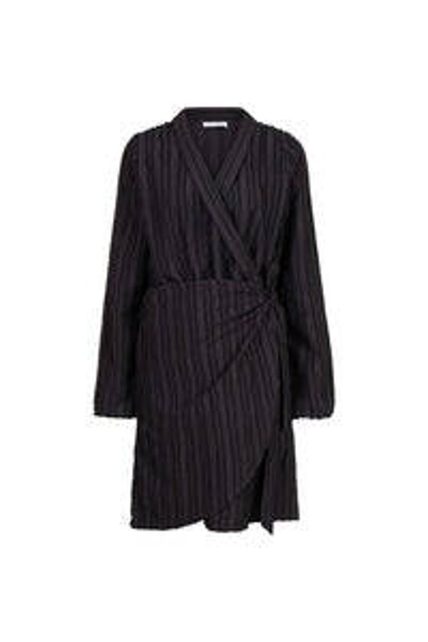 Jurk Madelyn is een zwarte jurk met een overslageffect en een onzichtbare drukknoop bij de borst. De wrap dress heeft een strikgedeelte aan de linkerkant, elastieken mouwuiteinden en elastiek in de taille. Qua fit is de jurk rechtvallend.