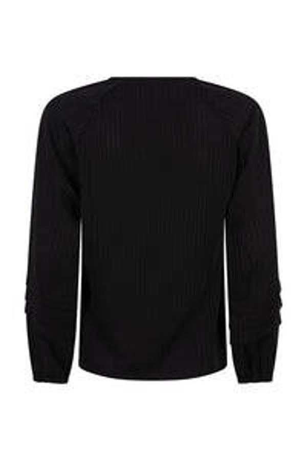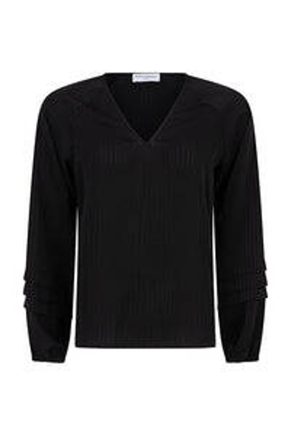 Blouse Giana is een losvallende zwarte blouse met V-hals en sierlijke details op de mouwen. De mouwuiteinden hebben elastiek wat voor een subtiel pofeffect zorgt.