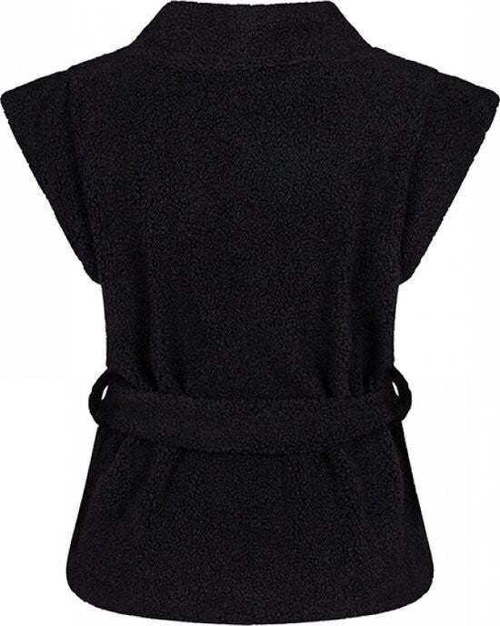Gilet Shannon is een trendy zwart gilet van teddy stof met een losvallende pasvorm en kapmouwtjes. Het gilet heeft riemlussen en een afneembare riem.Materiaal: 100% polyesterLengte gilet: 62 cm bij maat S