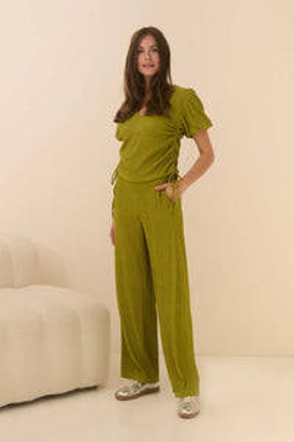 Top Celia is een top met V-hals, subtiele pofmouwen en rijgkoord aan beide kanten. De groene top heeft een rechtvallende pasvorm.