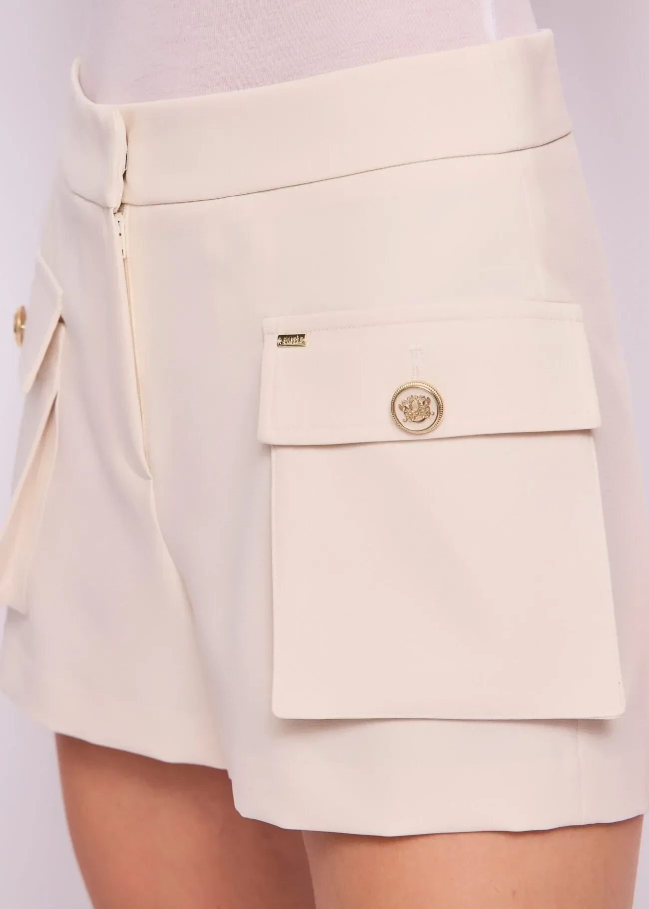 Kies voor de witte short van technisch materiaal met zakken aan de voorkant en een metalen logo. Een perfecte mix van elegantie en casual-chic stijl.