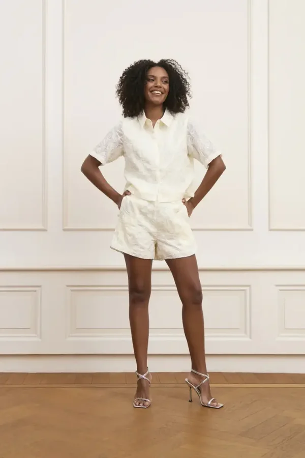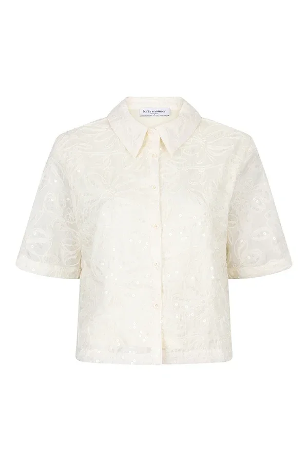 Blouse Ivy is een blouse in de kleur gebroken wit. De witte blouse heeft een klassieke kraag, korte mouwen en knoopjes over de gehele lengte. De blouse is gemaakt van een geborduurde stof en het design is subtiel versierd met pailletten. De blouse heeft een rechtvallende pasvorm. Draag de witte blouse als co-ord set met short Candice.