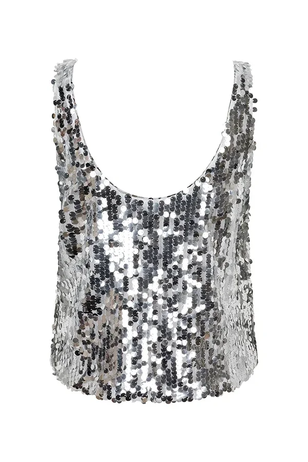 Top Zara is een zilveren top gemaakt van stof met pailletten. De feestelijke top is mouwloos en heeft aan zowel de voor- als achterkant een lage hals. De zilveren top heeft een rechtvallende pasvorm
